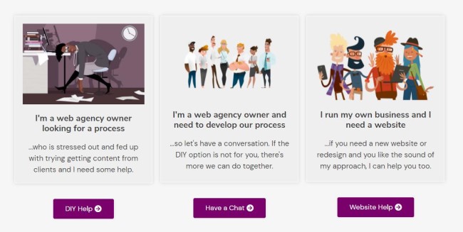 When using the Power of 3, as a way to guide a buyer’s decision, each option should have a call to action to tell the web visitor what it is they need to do next.